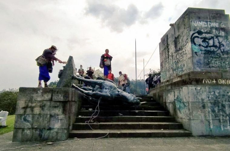 Indígenas colombianos, miembros de la comunidad Misak, tiraron abajo una estatua del conquistador español Sebastián de Belalcázar situada en la localidad de Popayán, al suroeste de Bogotá, con el objetivo de “reinvidicar la memoria de ancestros asesinados y esclavizados por las élites”.