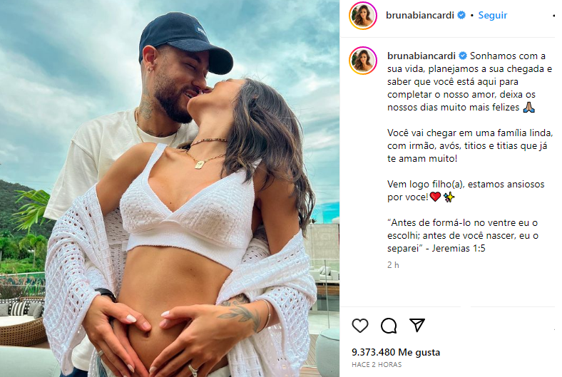 Neymar y Bruna Biancardi anunciaron que serán padres. “Soñamos con tu vida, planeamos tu llegada y saber que estás aquí para completar nuestro amor hace que nuestros días sean mucho más felices”, reza el mensaje que compartió la joven en su cuenta de Instagram.