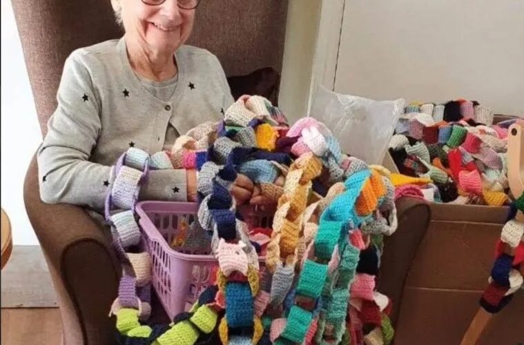 Una residente de un centro de asistencia de Gran Bretaña está recibiendo ayuda de miembros de la comunidad y de lugares tan lejanos como Nueva Zelanda en su proyecto de batir el récord Guinness de la cadena tejida más larga del mundo.